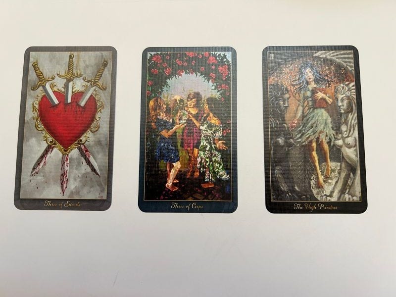 What dream am I revisiting? - 3 of swords. I tried to move in the spring of this year. It didn’t work out. I put it on hold. Time to revisit the dream. What does security feel like? - 3 of cups. It feels like heartfelt connection with others. I like that 2 - 3’s showed up for this spread about trines (3). I’d like to think that this 3 of cups has the potential to heal any leftover pain from the 3 of swords. And that I’ve got people in my corner to help me with what I need. What hidden nourishment is rising to feed me? The High Priestess. Learning to trust the intuitive flow, one step at a time. 2025 has been a year where I truly can’t see any further than right in front of me. Learning to trust the intuitive guidance is key for me. What did your pull for October look like? -Cassandra the Card Reader |