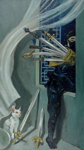 [7 of swords] As strangers in a strange land, our minds think in one idiom as our tongues stumble over another. We work by night and day to establish a place for ourselves. Everything we own we must scavenge, and in that sense, we are thieves and parasites, even as we are the heroes of our own stores. -T. Susan Chang 36 Secrets We are crossing a threshold but don’t know where we stand. This final decan of Aquarius is ruled by the Moon. The moon is trying to feel into something that is rigid like cold steel.